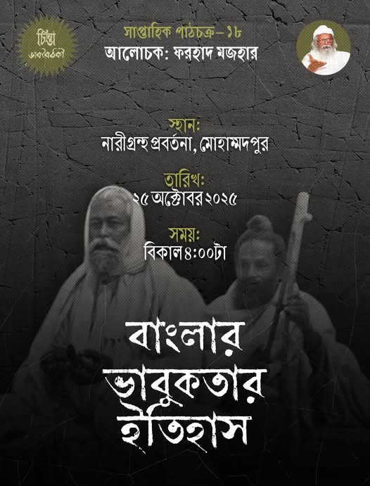 “বাংলার ভাবুকতার ইতিহাসের তিনটি মুহূর্ত। প্রথম হচ্ছে ‘তন্ত্র’। এই ধারার শুরু দেহকে সত্য  মেনে। পাশ্চাত্য দর্শন বস্তুজগতকে কেন্দ্র করে গড়ে উঠলেও, বাংলার ভাবুকতার ইতিহাস তন্ত্র থেকে শুরু হয়েছে, কারণ এখানে জগতকে শরীরের দ্বারা উপলব্ধি করা হয়। এটি শরীরকেন্দ্রিক চিন্তা থেকে গড়ে উঠেছে এবং দেহই এখানকার প্রথম দার্শনিক ভিত্তি। বাংলার ভাবুকতার দ্বিতীয় মুহূর্ত ‘রস’। তন্ত্রের বিকৃতির প্রতিবাদে চৈতন্য এই ধারার প্রবর্তন করেন। তিনি বললেন, আল্লাহ বা ঈশ্বর মানুষের মধ্যেই বাস করেন, তাই শরীরের ওপর অত্যাচার করা মানে আল্লাহকেই অত্যাচার করা। এরপর আসে বাংলার ভাবের চূড়ান্ত ও তৃতীয় মুহূর্ত : ‘ভাব’। ফকির লালন শাহ এসে বললেন, দেহ ও রস সবই ভালো, কিন্তু তা যথেষ্ট নয়। এইভাবে বাংলার ভাবুকতার ইতিহাসের সূত্র ধরিয়ে দেন ফরহাদ মজহার।  চিন্তা পাঠচক্রে ২৫ অক্টোবর ২০২৫ এই শিরোনামে আলোচনা করেন ওস্তাদ ফরহাদ মজহার। অনুলিখন ও সম্পাদনা করেন আরিফ বিল্লাহ।