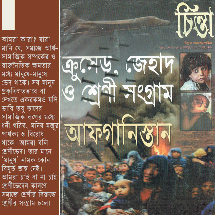 লড়াকু আহমদ ছফা আর কাছে নেই; কিন্তু তার নাম ধারণ করে বানানো ‘আহমদ ছফা রাষ্ট্রসভা’-র প্রথম আলোচনা অনুষ্ঠান ‘ক্রুসেড, জেহাদ ও শ্রেণীসংগ্রাম’। আফগানিস্তানে সাম্রাজ্যবাদী আগ্রাসন ও হিংসা-যুদ্ধ এবং আমাদের কর্তব্য বিষয়ে এই সভা। আরও বড়ো পরিসরে বললে দুনিয়া জুড়ে পুঁজির বিরুদ্ধে বিভিন্ন সম্প্রদায়, জাতি, জনগোষ্ঠি, রাষ্ট্র কিম্বা নারী ও পুরুষের মধ্যে যে লড়াই চলছে তাকে শ্রেণীসংগ্রামের দিক থেকে বোঝার চেষ্টা করা। লড়াইয়ের বাস্তব রূপ যেমন আছে, তেমনি তার বাস্তব ভাষাও আছে, কেতাবি ভাষা নয়। স্থানকালপাত্র বা ইতিহাস ভ (আরো পড়ূন)