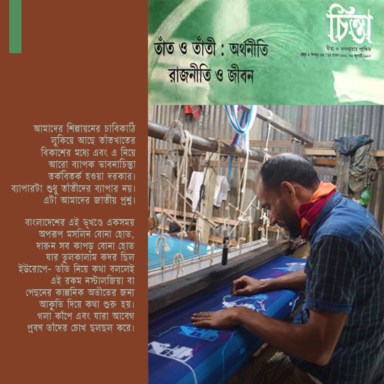 (দেশের বিভিন্ন এলাকার তাঁতীদের অবস্থা সম্পর্কে জানার সুযোগ সাধারণত হয় না। তবু তাঁত বন্ধ হয়ে যাচ্ছে, তাঁতীদের সারিষ, সুতানাচার অভাব, পুঁজির টানাটানি ইত্যাদি খবর মাঝেমধ্যে পত্রিকায় আসে। যেটা আসে না সেটা হোল তাঁতখাতের হালহকিকত। আমরা কি এগুচ্ছি নাকি পিছিয়ে যাচ্ছি তার হদিস নেই। এই সব কথা ভেবে ভীত ও তাঁতীদের নিয়ে এই ক্রোড়পত্র। পাঠকদের